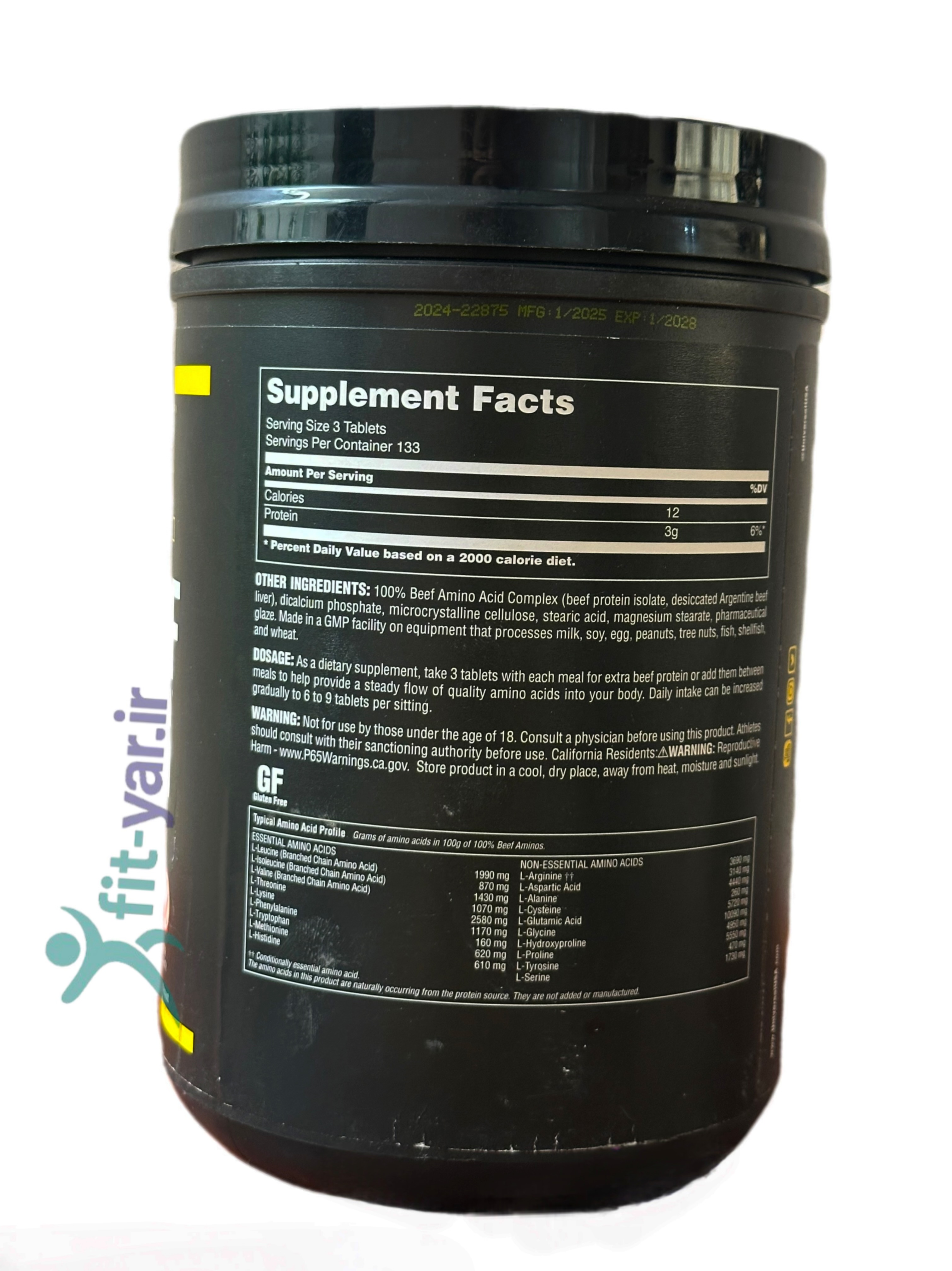 مکمل 100% Beef Aminos از برند معتبر Universal Nutrition، یکی از قدرتمندترین منابع آمینواسیدی مشتقشده از گوشت خالص گاو است. هر قرص این محصول حاوی ۱ گرم پروتئین خالص گوشت گاو بوده و طی فرآیند پیشرفته هیدرولیز تولید شده تا جذب سریع و اثربخشی بالا را برای بدن به ارمغان آورد.
